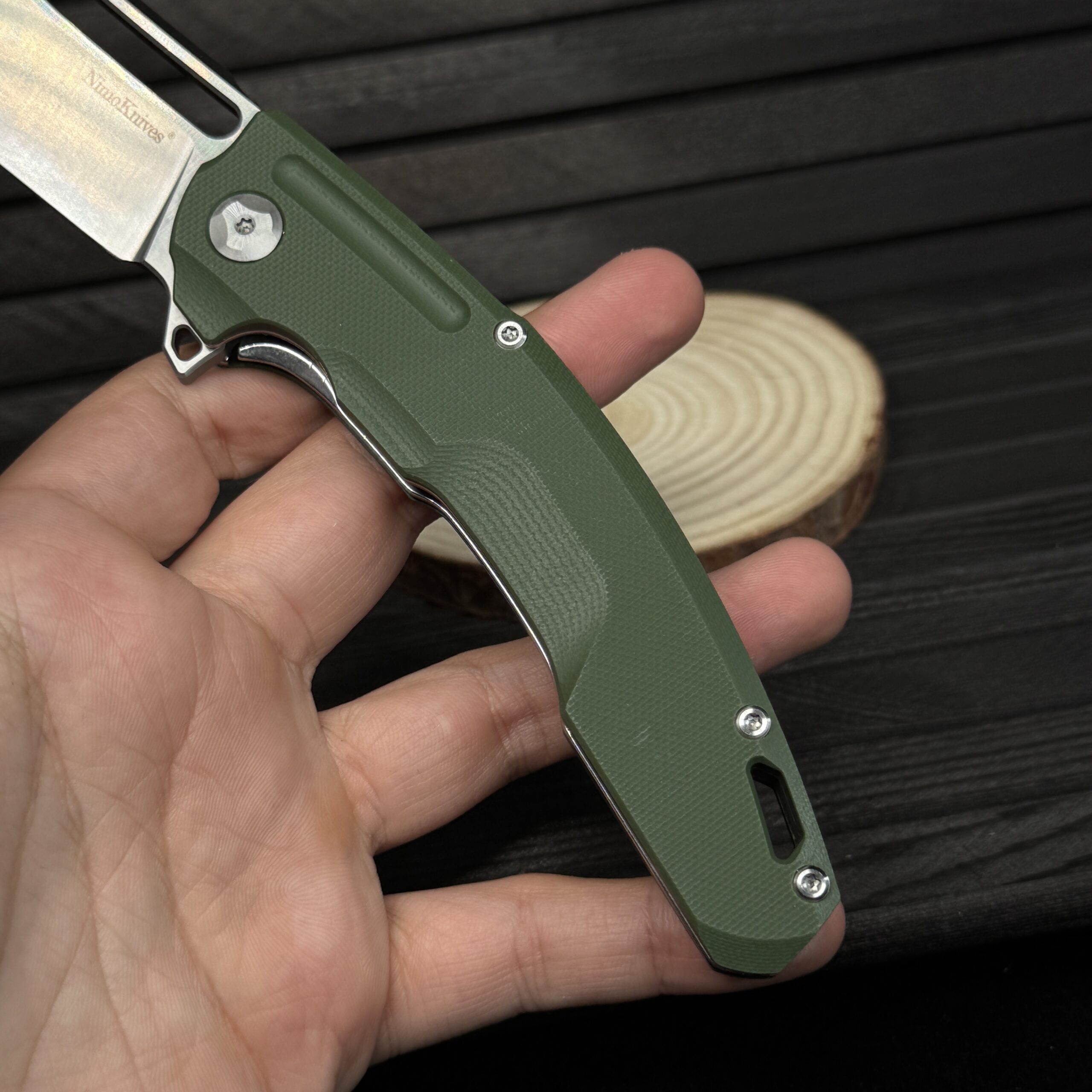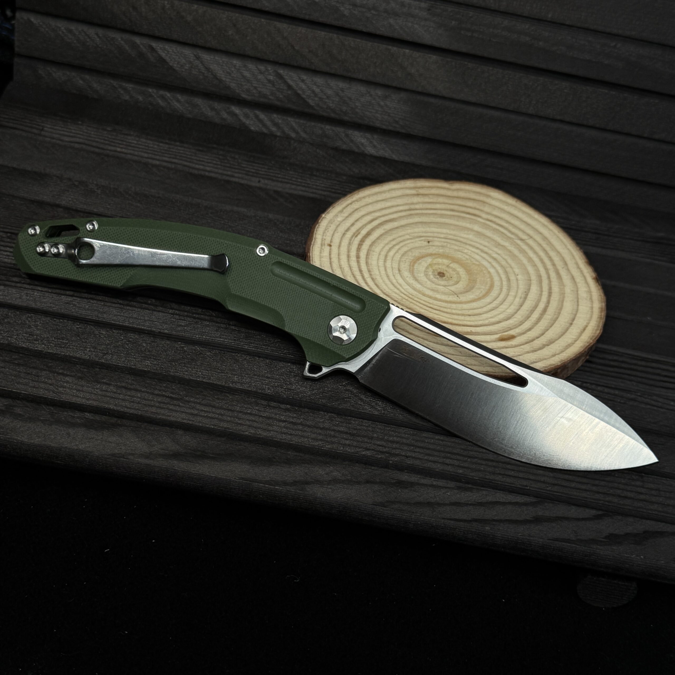 المقبض :- من ستانلس ستيل مغطى بطبقات من G10 ليعطي مسكة مريحة جدا مع Clip خصر