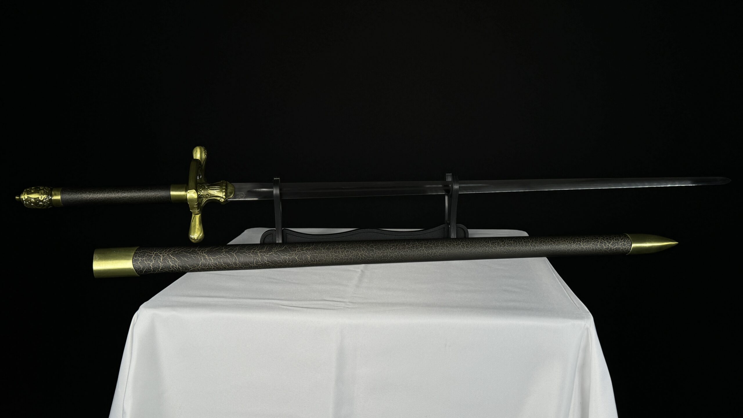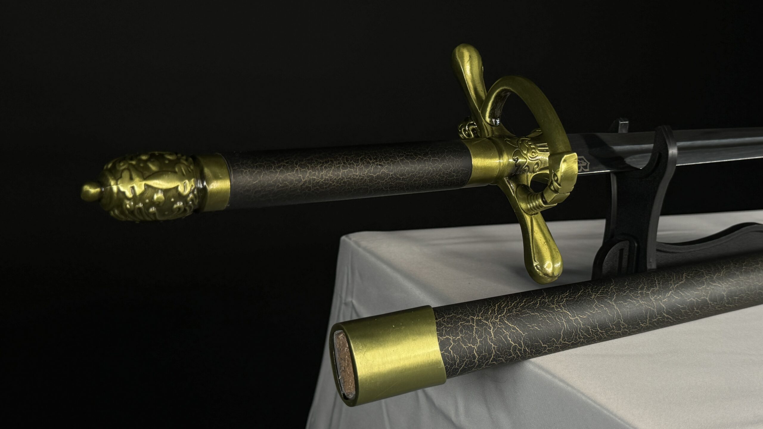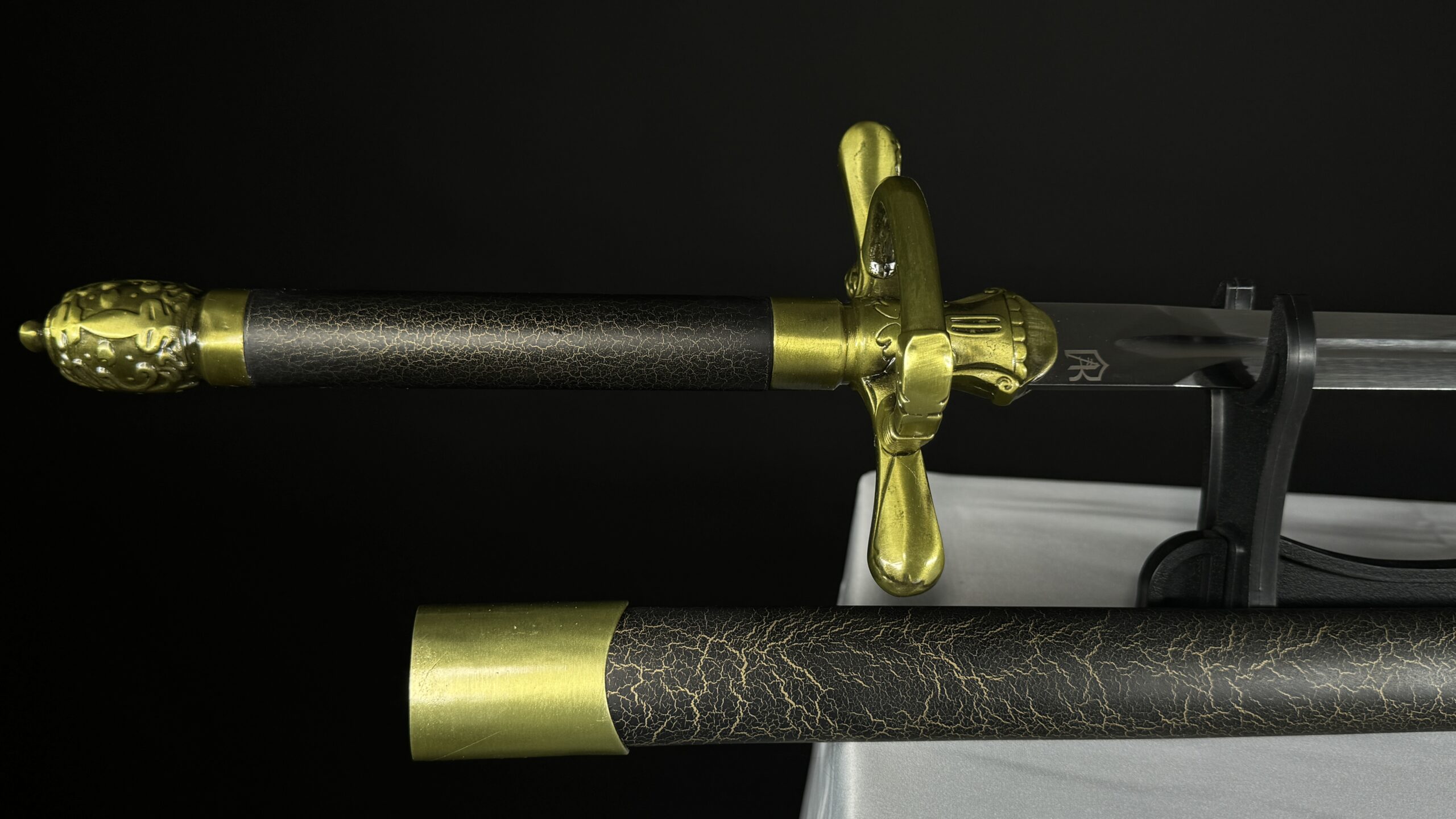 الغمد مصنوع من خشب صناعي بريميوم مع اضافات زينك ألوي بريميوم ، و النصل مزخرف نسخة طبق الاصل